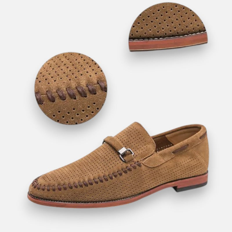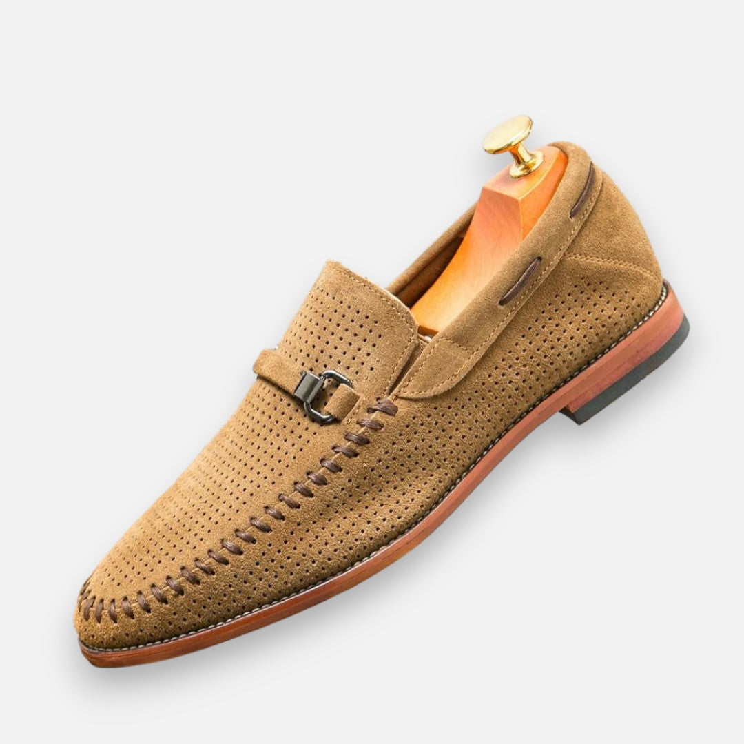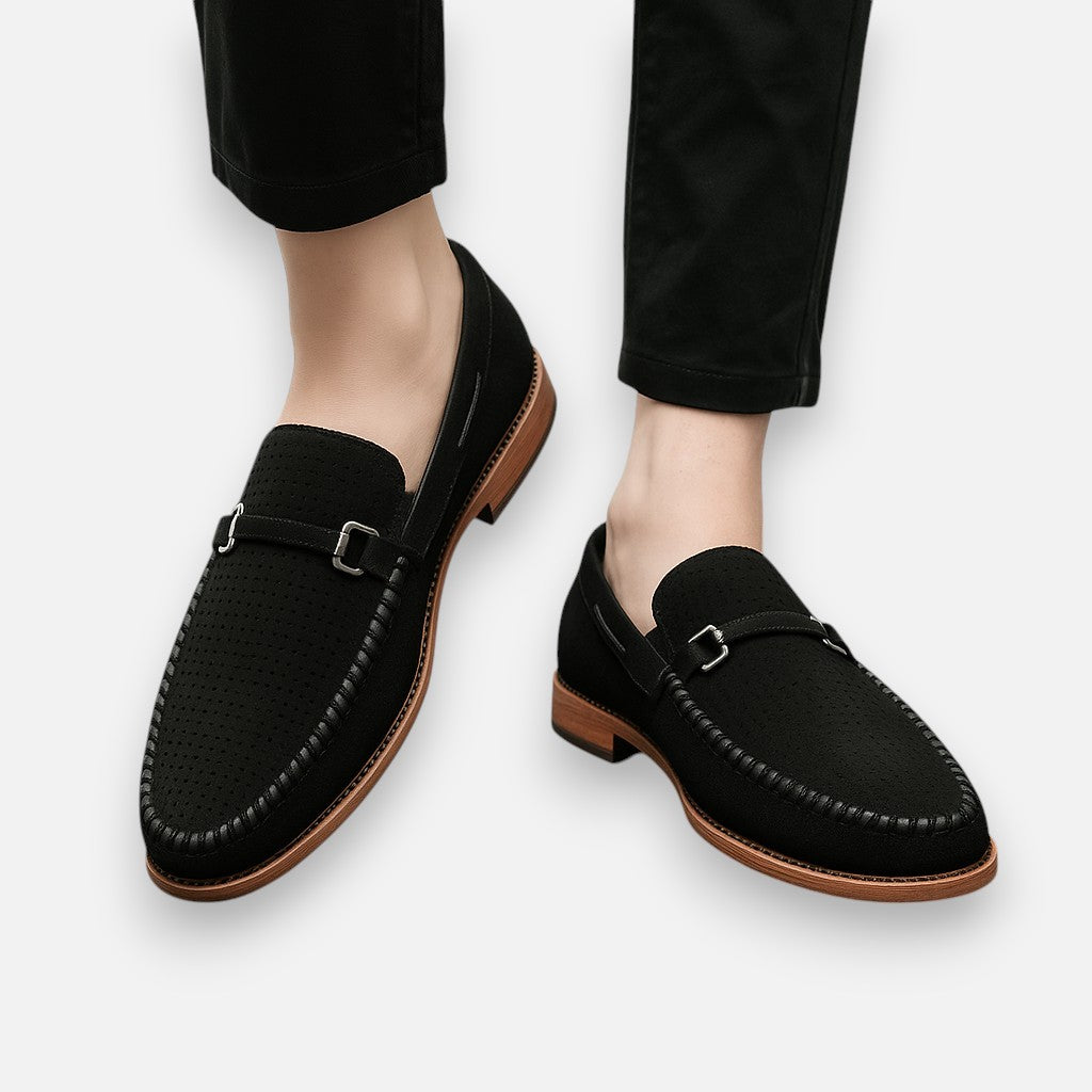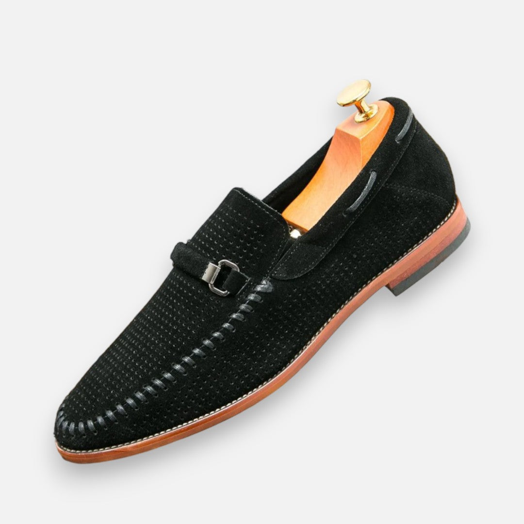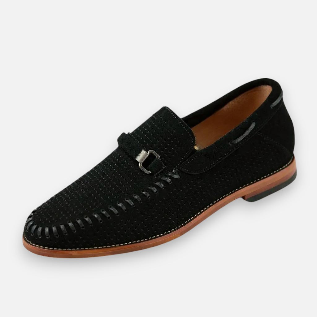 Maak elke stap stijlvol met deze handgestikte suède schoenen. Het verfijnde metalen detail geeft een chique accent, terwijl het zachte voetbed zorgt voor comfort dat de hele dag meegaat. Dankzij het ademende bovenwerk blijven je voeten fris en voel je je zelfverzekerd – of je nu kiest voor een zakelijke outfit of een meer casual look. Deze schoenen brengen klassieke klasse samen met modern gemak.