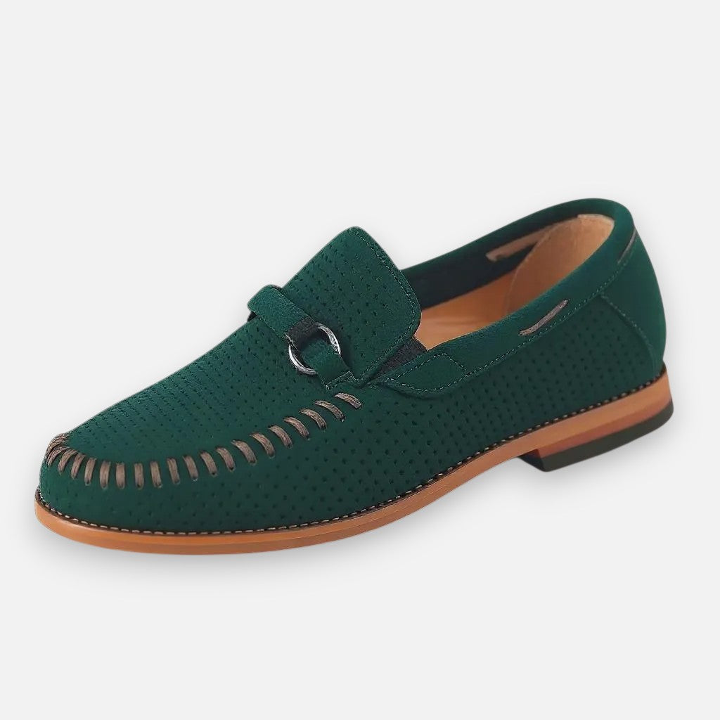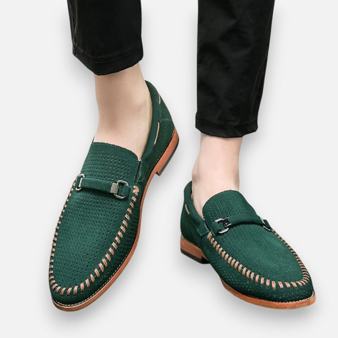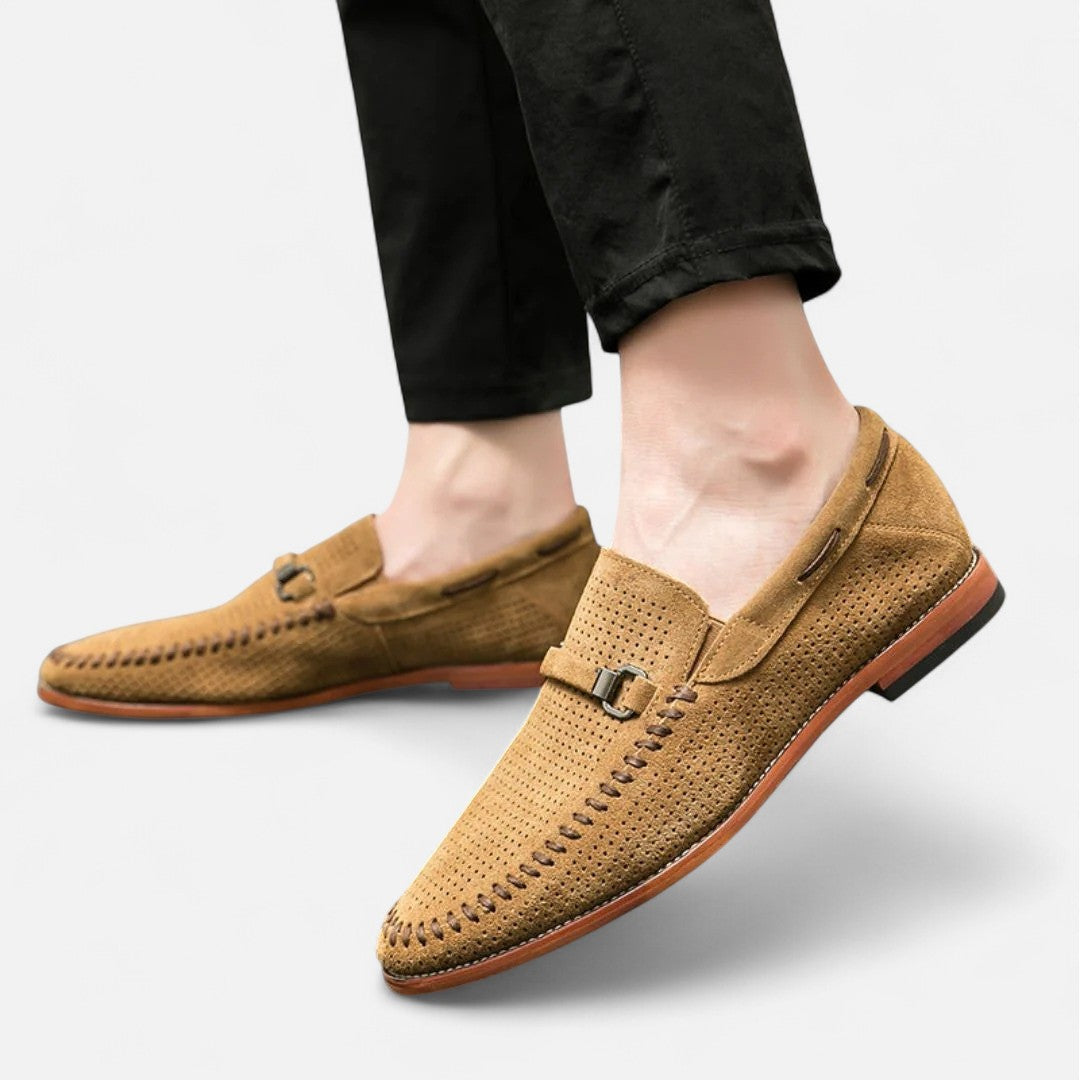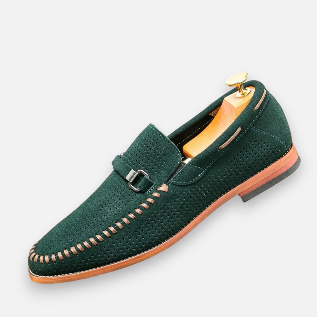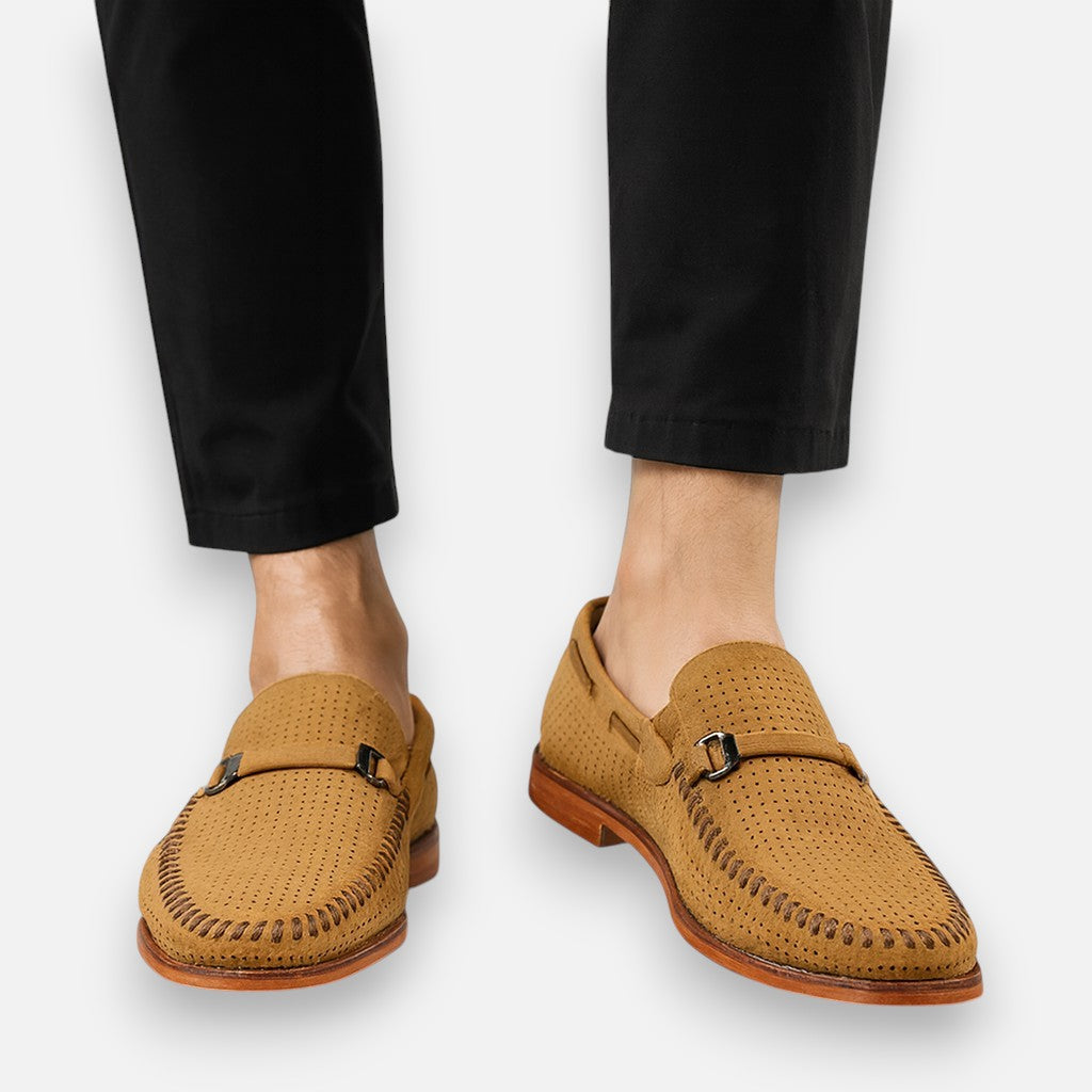 Maak elke stap stijlvol met deze handgestikte suède schoenen. Het verfijnde metalen detail geeft een chique accent, terwijl het zachte voetbed zorgt voor comfort dat de hele dag meegaat. Dankzij het ademende bovenwerk blijven je voeten fris en voel je je zelfverzekerd – of je nu kiest voor een zakelijke outfit of een meer casual look. Deze schoenen brengen klassieke klasse samen met modern gemak.
