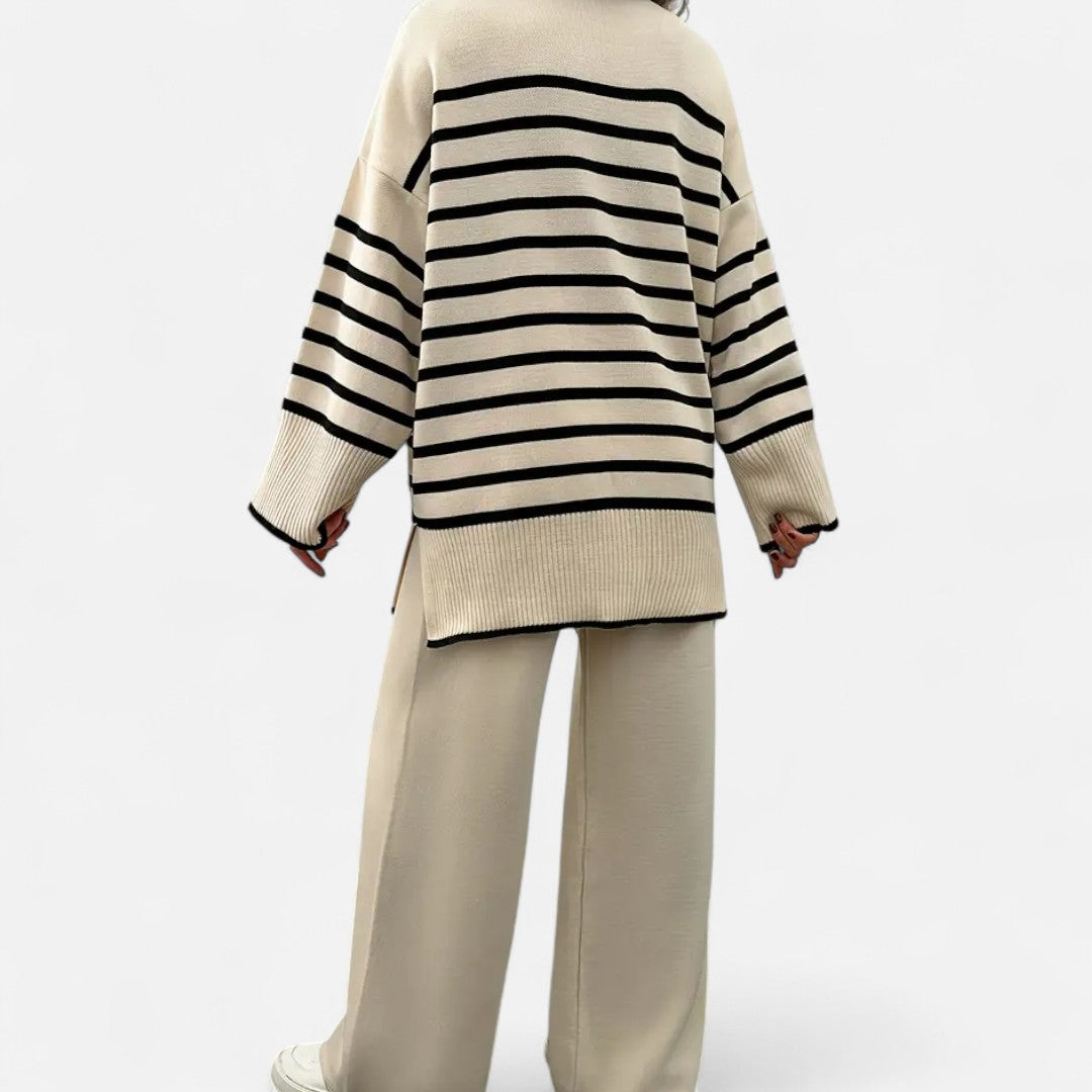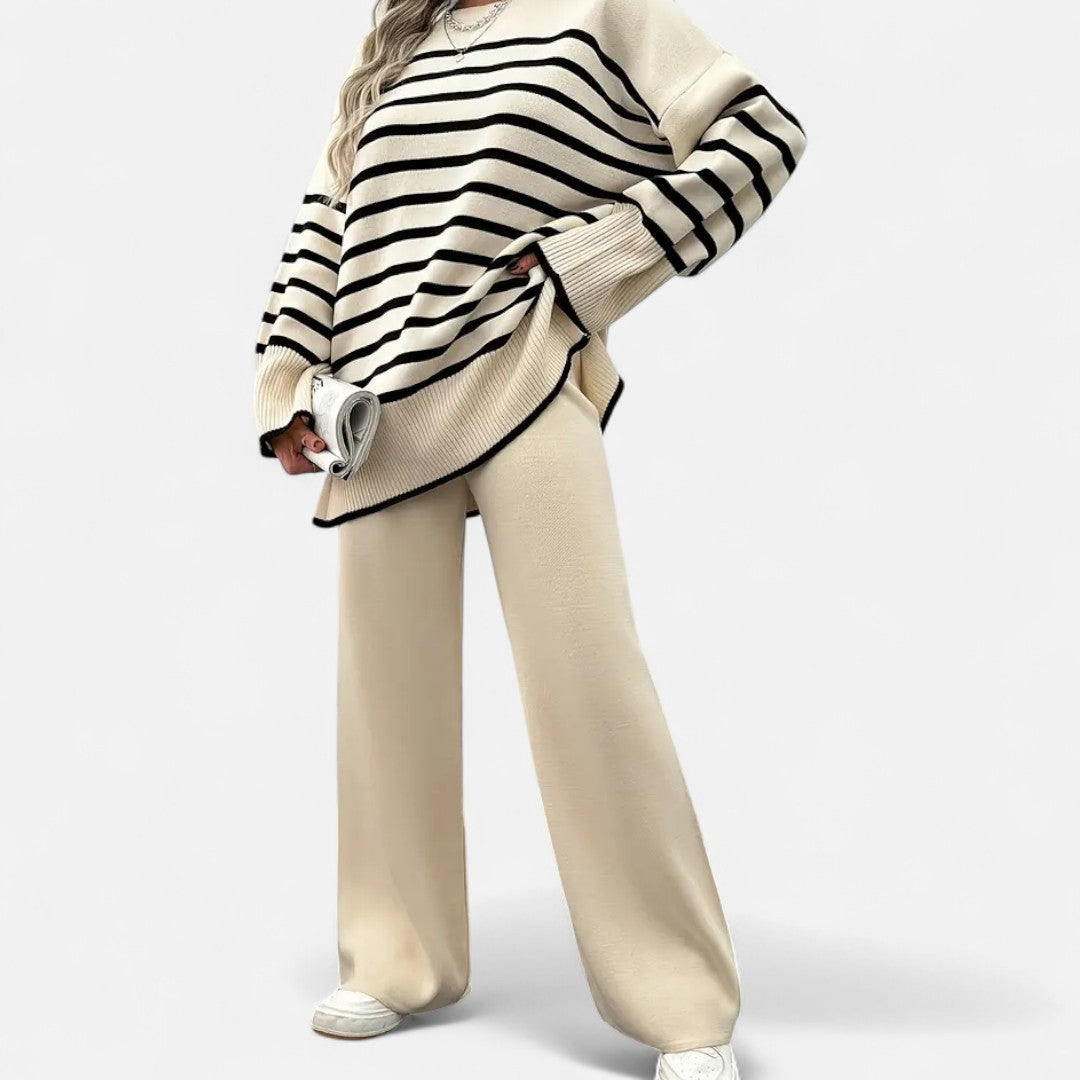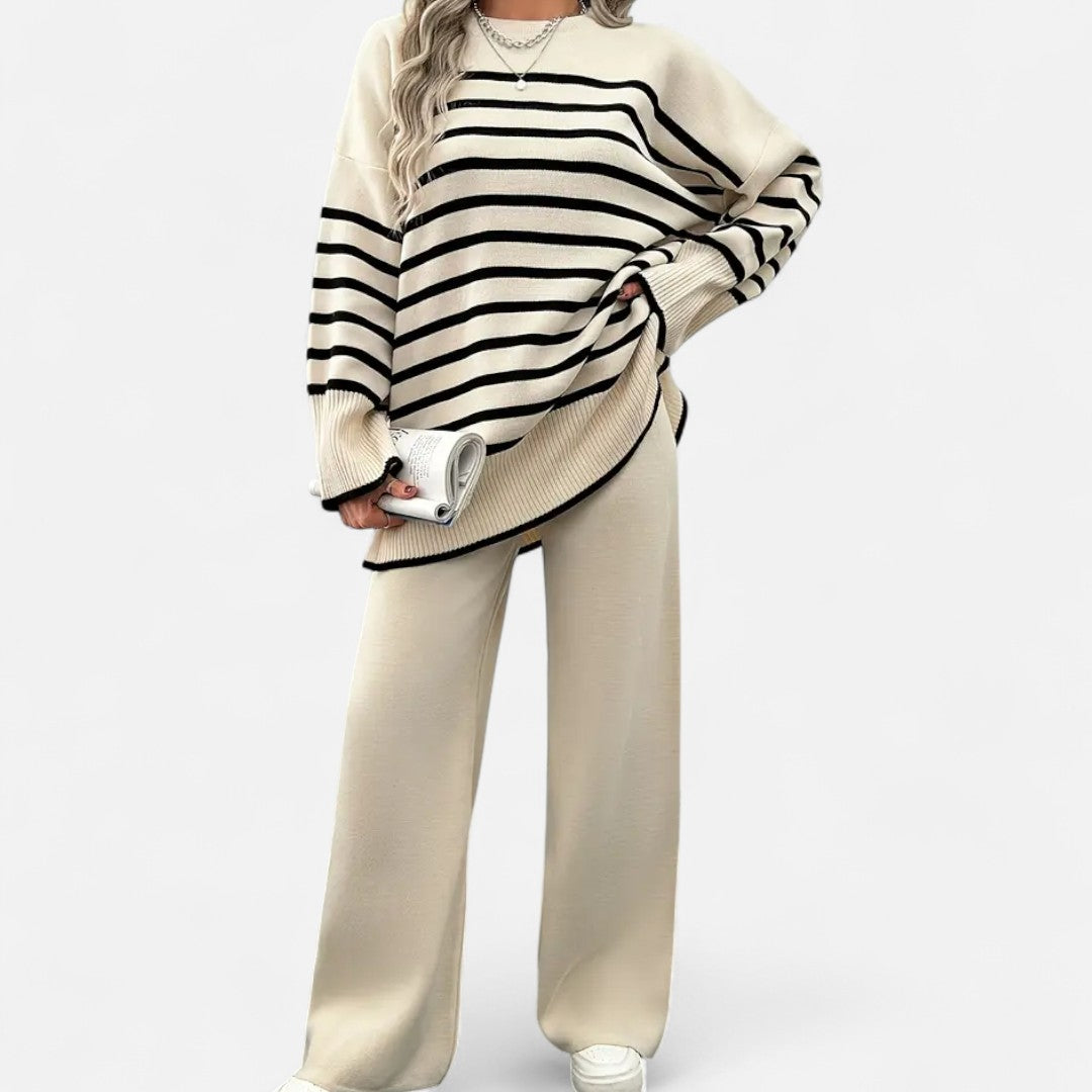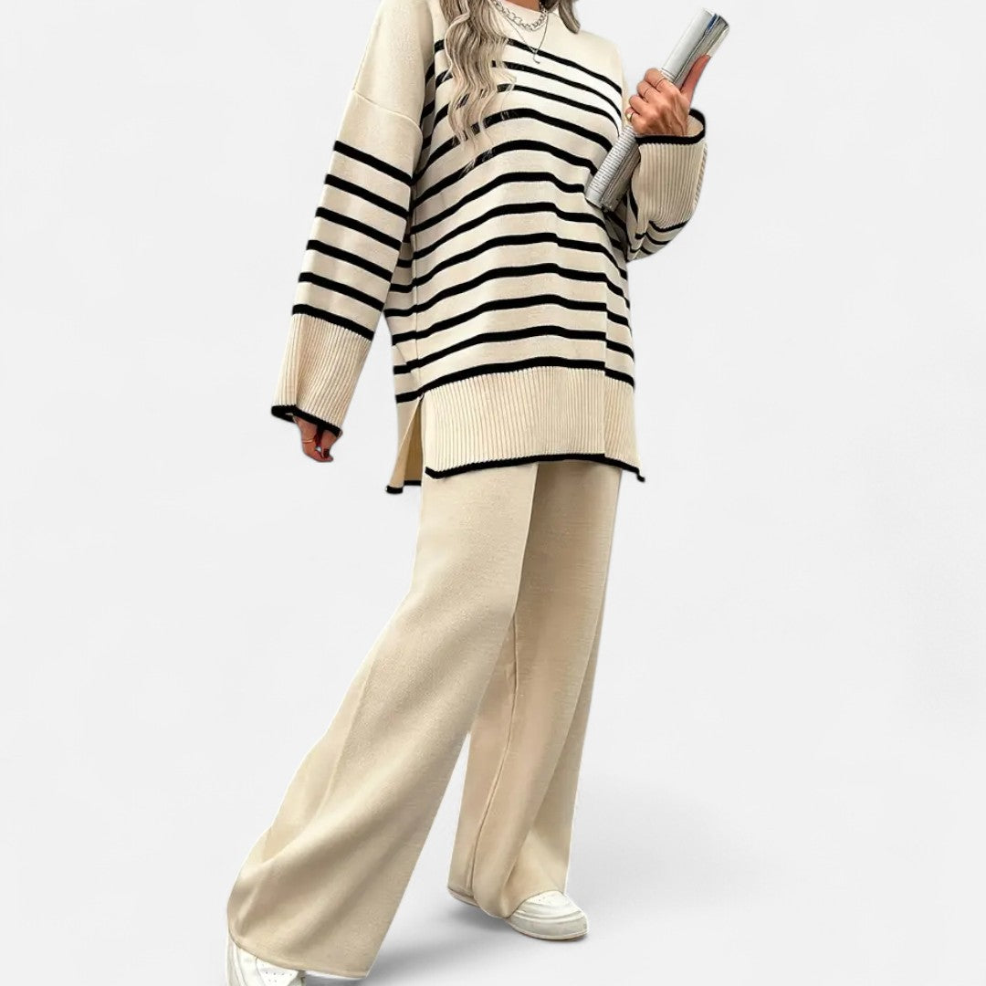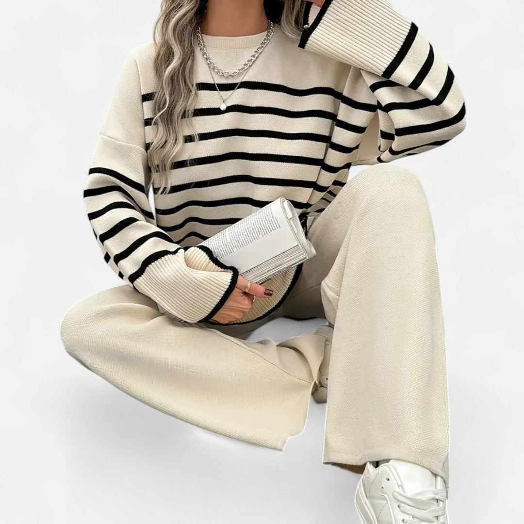 Lima Bay | Dames Gestreepte Trui en Broek Set – Beige Zwart Comfort