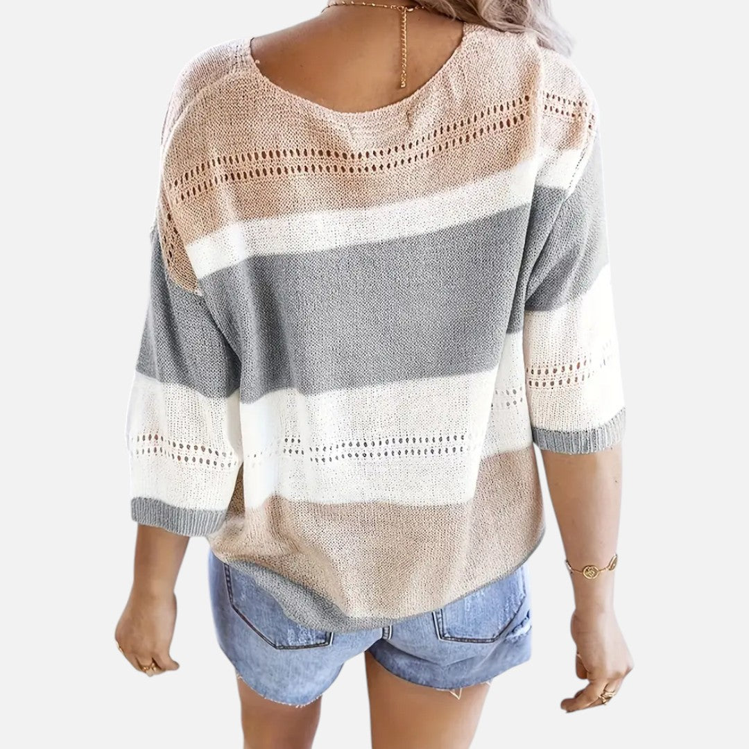 Stel je voor: een zonnige lentedag waarop je deze trui draagt naar een terras, of een zomerse avondwandeling waarbij je moeiteloos stijlvol blijft. De luchtige stof, de speelse kleurblokken en de verfijnde V-hals geven je look een subtiele maar opvallende charme.