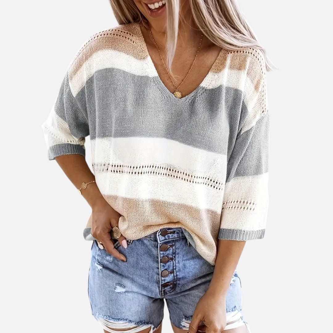 Lima Bay | Dames Trui met V-hals en Korte Mouwen in Kleurblokken